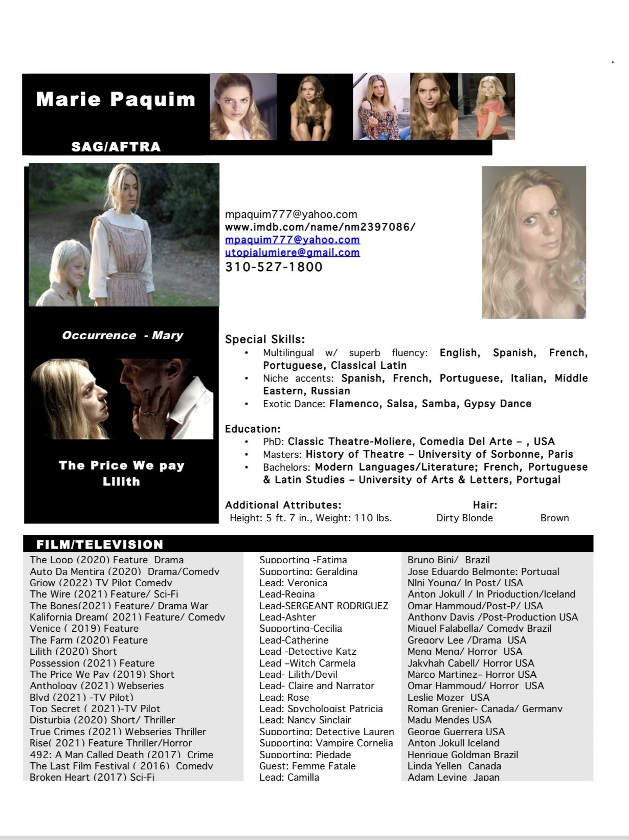 Marie Paquim is a versatile actress with a diverse portfolio showcasing her talent across various genres and mediums. Her resume highlights her extensive experience in film, television, and theater, where she has taken on a range of roles that demonstrate her dynamic acting skills. Marie’s work includes leading roles in independent films, guest appearances on popular TV series, and standout performances in stage productions. Her dedication to her craft and her ability to bring depth and authenticity to her characters make her a valuable addition to any production.