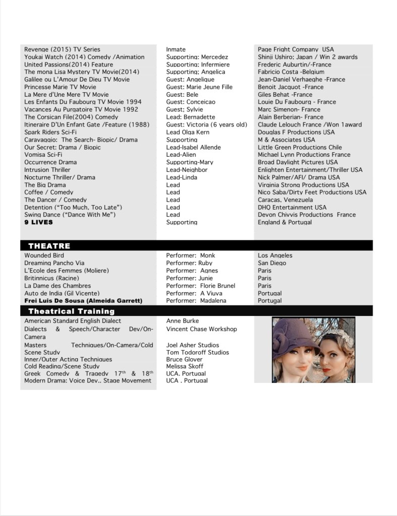 Marie dived into the arts with a debut as a baby actor in a Johnson’s Shampoo commercial, and from there becoming a versatile dancer (including flamenco) and then a film actress, Thanks to a traditional family that valued education, her budding film career took a break till she received her Masters degree at the University of Sorbonne, Paris, where she mastered classical Latin and Greek, and then finally her Doctorate in Classical Theatre (with special studies on Moliere and Comedia Del Arte) at one of Europe’s oldest and most prestigious universities, Coimbra University in Portugal. Moving her talents across the pond to America, Marie wanted to learn even more, and worked on the production side of the Tom Cruise vehicle “Vanilla Sky”. Watching her going about her duties one day on the set, director Cameron Crowe told her, “You belong in front of the camera, not behind it,” and quickly improvised a scene for her so she could obtain her SAG / AFTRA card in America.